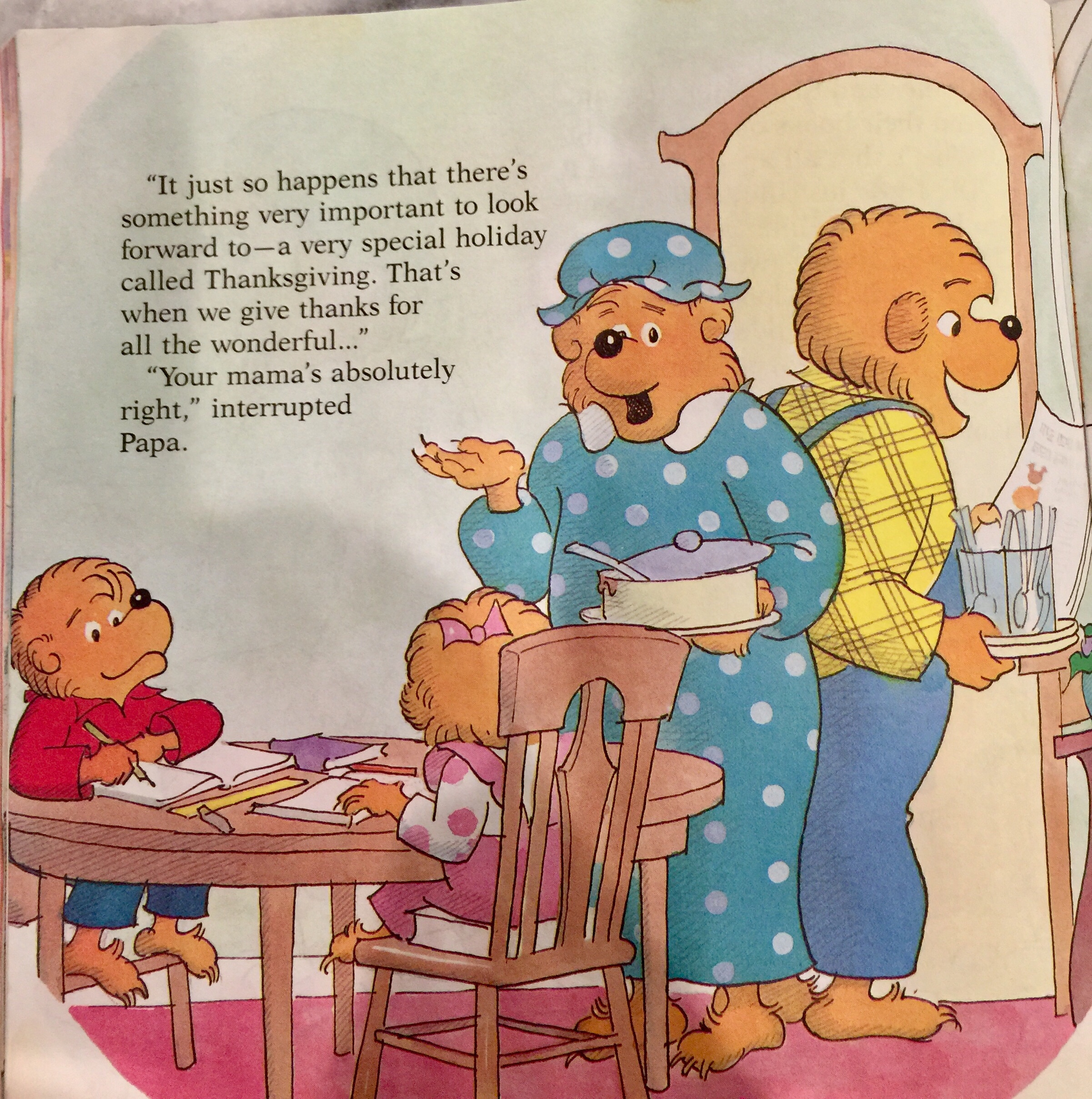 Mansplaining for bears: Less fun than manscaping. While reading a Berenstain Bears book to my niece, G, today, I was blindsided by misogyny. Mama Bear attempted to explain Thanksgiving to the cubs, but Papa Bear interrupted Mama Bear and mansplained all over her monologue. Page images below.